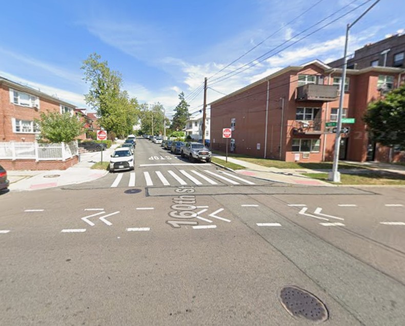 The intersection itself presents multiple challenges. Sanford Avenue has an unprotected, westbound bike lane. 160th Street shifts from a one-way southbound street to a two-way street just south of Sanford. There are no traffic signals, and cyclist markings are minimal — conditions that demand heightened caution from drivers turning across bike lanes.