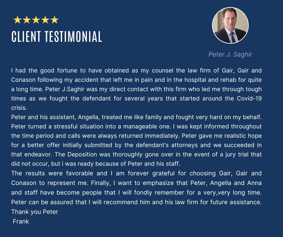 Behind every successful case are months or years of preparation, countless conversations with clients, and a legal team committed to standing beside people during some of the most challenging moments of their lives. Reviews like this offer a small glimpse into that process and the work attorneys and their legal team like Peter J. Saghir, Angella and Anna do every day on behalf of injured clients.